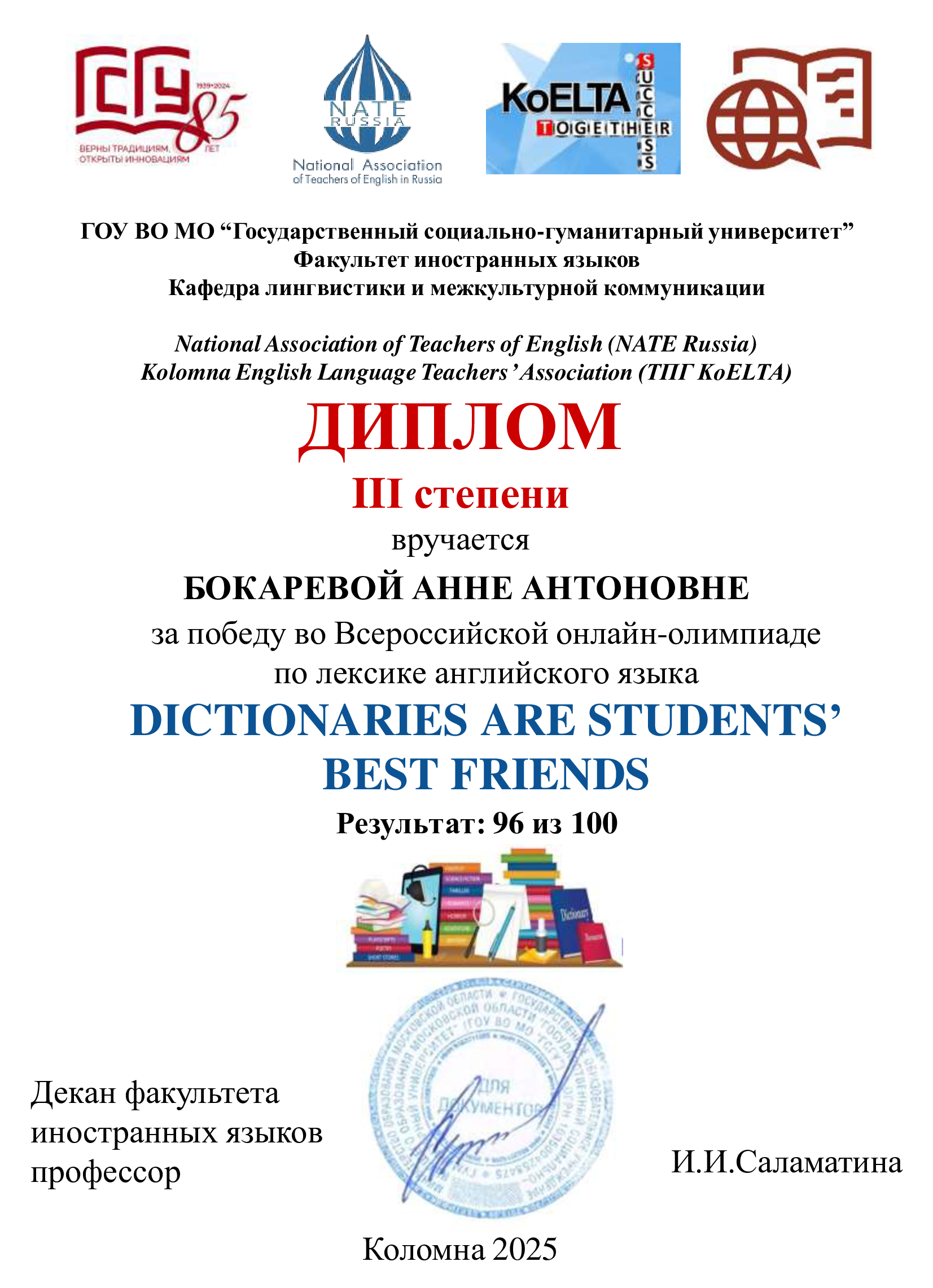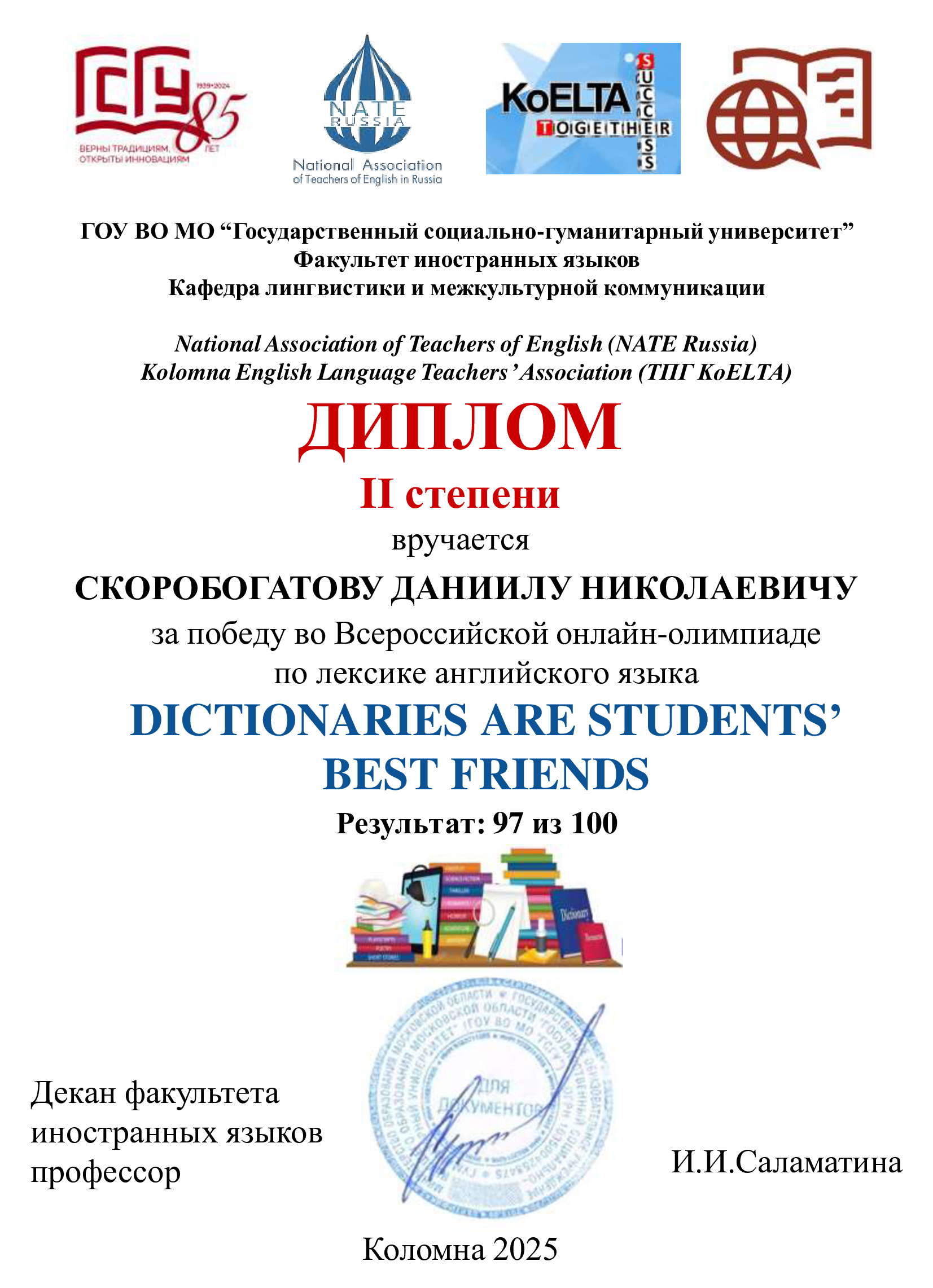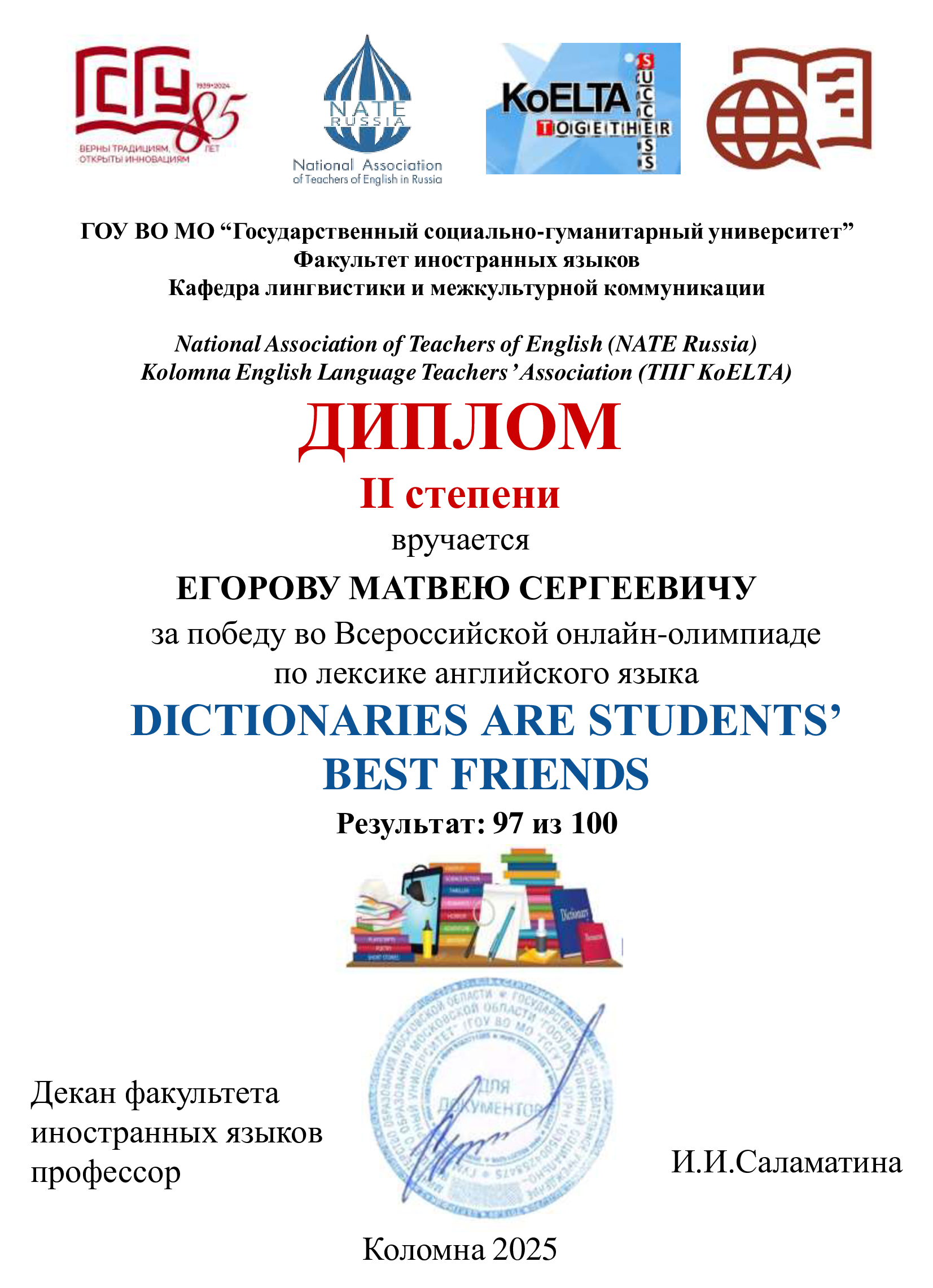 Остальные студенты, выполнившие правильно более 25% заданий олимпиады, получили сертификат участника Всероссийской онлайн-олимпиады по лексике английского языка «Dictionaries Are Students’Best Friends». Участник онлайн-олимпиады Горюнов Владислав Алексеевич (группа ТСО-105Б-25) так ответил на вопрос об этой олимпиаде: «Борьба была сложной и мне не хватило всего одного балла, чтобы стать победителем! Но я рад за наших ребят, что они смогли выиграть эту олимпиаду. Спасибо за участие организаторам, которые уже несколько лет подряд проводят такие увлекательные олимпиады. Победитель данной олимпиады, студент третьего курса – Власенко Михаил Александрович так описал свои чувства и эмоции: «Я шел к этому три года, поскольку я – участник трех сезонов данной олимпиады. Сначала я просто участвовал, затем я стал победителем! И я не ожидал, что я выиграю. До последнего момента не верил. Я безумно рад! И дело даже не в дипломе, а в том, что я действительно преодолел этот достаточно долгий путь, чтобы стать победителем!» Поздравляем победителей и участников с успешным выступлением на олимпиаде по лексике английского языка!